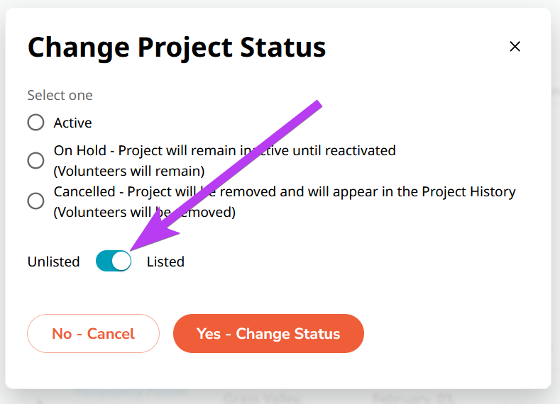 - In this new window is a toggle which allows you to list or unlist your project. "Listed" means the project will be returned in project searches.
